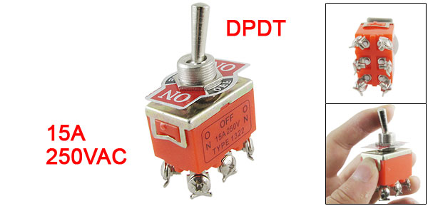 Product Name Toggle Switch Type DPDT (ON/OFF/ON), Latching Position 3 Mounting Hole Diamter 11.8mm / 0.46" Voltage & Current 15A/250VAC Main Body Size 31.5 x 19.7 x 21.7mm / 1.2" x 0.77" x 0.85"(L*W*H) Overall Height 57mm / 2.2" Material Metal and Resin Weight 32g Package Content 1 x Toggle Switch - Reviews