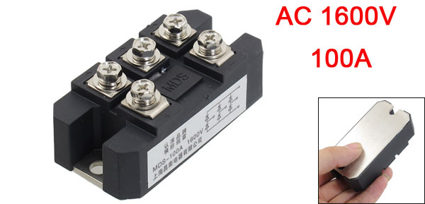Product Name Rectifier Module Model MDS-100A-1600V Max. Average Forward Current 100A Max. Working Peak Reverse Voltage AC 1600V Terminals 5 Mount Hole Size 6.5mm/ 0.26"(Diameter), 9 x 6mm/ 0.35" x 0.24"(L*W) Mount Hole Distance 65mm/ 2.56"(Center to Center) Total Size 79 x 39 x 34mm/ 3.11" x 1.53" x 1.34" (L*W*H) Material Metal, Plastic Color Black, Silver Tone Net Weight 172g Package Content 1 x Rectifier Module