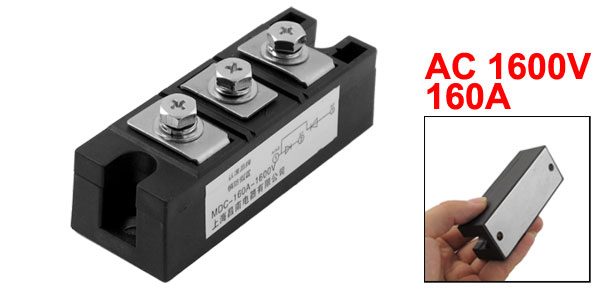 Product Name Rectifier Module Model MDC-160A-1600V Max. Average Forward Current 160A Max. Working Peak Reverse Voltage AC 1600V Terminals 3 Mount Hole Diameter 6.5mm/ 0.26" Mount Hole Distance 80mm/ 3.15"(Center to Center) Total Size 95 x 34 x 38mm/ 3.74" x 1.34" x 1.5" (L*W*H) Material Metal, Plastic Color Black, Silver Tone Net Weight 253g Package Content 1 x Rectifier Module - Reviews