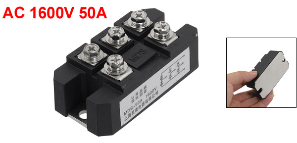 Product Name Rectifier Module Model MDS-50A-1600V Max. Average Forward Current 50A Max. Working Peak Reverse Voltage AC 1600V Terminals 5 Mount Hole Size 6.5mm/ 0.26"(Diameter), 9 x 6mm/ 0.35" x 0.24"(L*W) Mount Hole Distance 65mm/ 2.56"(Center to Center) Total Size 79 x 39 x 34mm/ 3.11" x 1.53" x 1.34" (L*W*H) Material Metal, Plastic Color Black, Silver Tone Net Weight 170g Package Content 1 x Rectifier Module