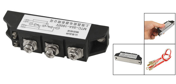 Product Name Rectifier Module Model MTC-55A-1600V Max. Average Forward Current 55A Max. Working Peak Reverse Voltage AC 1600V Terminals 3 Number of Pins 4 Mount Hole Diameter 6.5mm/ 0.26" Mount Hole Distance 80mm/ 3.15"(Center to Center) Cable Length 25cm/ 9.8" Total Size 93 x 20 x 35mm/ 3.66" x 0.79" x 1.38" (L*W*H) Material Metal, Plastic Color Black, Silver Tone Net Weight 118g Package Content 1 x Rectifier Module