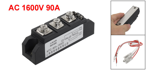 Product Name Rectifier Module Model MTC-9A-1600V Max. Average Forward Current 90A Max. Working Peak Reverse Voltage AC 1600V Terminals 3 Number of Pins 4 Mount Hole Diameter 6.5mm/ 0.26" Mount Hole Distance 80mm/ 3.15"(Center to Center) Cable Length 25cm/ 9.8" Total Size 94 x 25 x 38mm/ 3.7" x 0.98" x 1.5" (L*W*H) Material Metal, Plastic Color Black, Silver Tone Net Weight 150g Package Content 1 x Rectifier Module