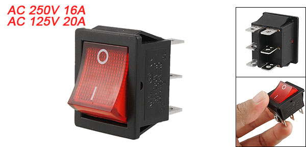 Item Name Rocker Switch Type On/ On (DPDT) Voltage & Current AC 250V 16A AC 125V 20A Size 3 x 2.5 x 3.5cm / 1.2" x 1" x 1.4"(L*W*H) Mount Hole Size 2.9 x 2.15cm / 1.1" x 0.85"(L*W) Color Black, Red Material Plastic & Metal Total Weight 14g Package Content 1 x Rocker Switch - Reviews
