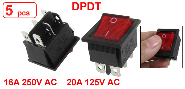 AC 16A/250V 20A/125V Red Light Illuminated DPDT ON/ON Boat Rocker Switch 5pcs