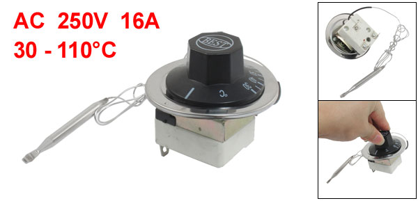 Product Name Temperature Capillary Thermostat Material Plastic, Resin, Metal Main Color Blue, Black Contact 1 NO 1 NC Power AC 16A, 250V Temperature 30 - 110°C Probe Length 70mm / 2.7" Capillary Length 80cm / 31.5" Capillary Diameter 1mm / 0.04" Base Dimensions 43 x 33 x 2.7cm / 16.9" x 13" x 1.1" (L*W*H) Pin Size 10 x 6.3mm / 0.39" x 0.25" (L*W) Overall Size (Excluding Capillary) 6.8 x 7cm / 2.67" x 2.75" (D*H) Net Weight 111g Package Content 1 x Temperature Capillary Thermostat - Reviews