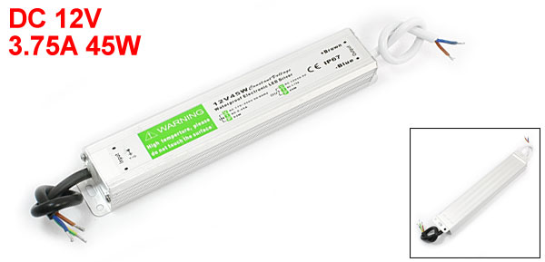 DetailsAC 170-250V to DC 12V 45W Waterproof LED Light Lamp Power Supply Driver  Product Name Waterproof LED Driver Input AC 170-250V 50/60Hz 0.45A 53W Output DC 12V±0.5V 3.75A 45W Protection Rank IP67 Overall Size(Approx.) 20.6 x 3.5 x 2.5cm/8" x 1.4" x 1"(L*W*T) Cable Length 10cm/3.9" Shell Material Aluminum Alloy, Plastic Main Color Silver Tone Net Weight 270g Package Content 1 x Waterproof LED Driver