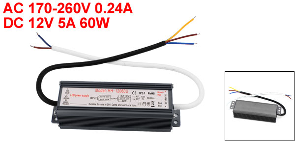 Main Color Gray Input AC 170-260V 0.24A Net Weight 330g Brand DMiotech Country of Manufacture CHINA Model HH-12060U Package Content 1 x LED Power Supply Protection Rank IP67 Material Aluminum, Plastic Output DC 12V 5A 60W Wire Length 25cm/ 10" Body Size 12.5 x 4.5 x 3.5cm/ 6" x 1.8" x 1.4"(L*W*H) - Reviews