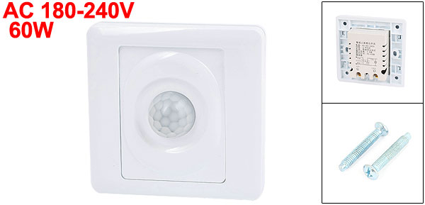 Product Name PIR Motion Sensor Switch Rated Voltage AC 180-240V Load Type Incandescent Output Power(Max.) 60W Delay Time 45-65s Detecting Distance 3-8m Screw Terminal 2 Overall Size 85 x 85 x 28mm/ 3.3" x 3.3" x 1.1"(L*W*T) Screw Hole Diameter 4mm/ 0.16" Screw Hole Center Distance 62mm/ 2.4" Material Plastic, Metal Color White Net Weight 87g Package Content 1 x PIR Motion Sensor Switch