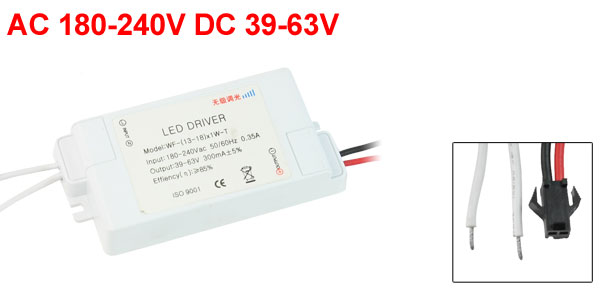 DetailsAC 180-240V DC 39-63V Stepless Dimmer Driver Power Supply for (13-18)*1W LED  Product Name ((13-18)*1W LED Driver Input AC 180-240V 50/60Hz 0.35A Output DC 39-63V 300mA Output Power (13-18)*1W Overall Size(Approx.) 9.5 x 4.4 x 2cm/3.7'' x 1.7'' x 0.8'' (L*W*T) Shell Material Plastic Main Color White Net Weight 78g Package Content 1 x LED Driver