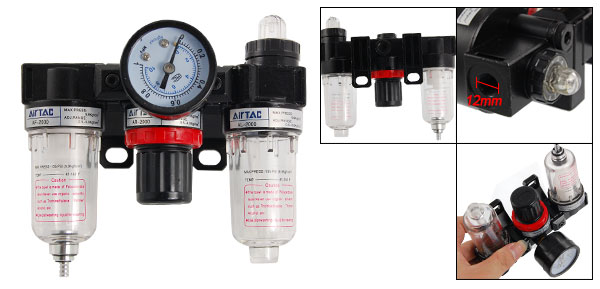 Product Name Air Source Treatment Unit Material Metal, Plastic Working Medium Air Max. Pressure 9.9kg/cm² Adjustable Pressure Range 0.5-9.0kg/cm² Joint Pipe Bore 12mm/ 0.47" Pressure Gauge Connector Dia 9mm/ 0.35" Pressure Gauge Range 0-10kg/cm² Total Size 13.5 x 5 x 12.5cm / 5.3" x 2" x 4.9"(L*W*H) Pressure Gauge Size 4 x 2.5cm/1.6" x 1"(D*T) Color Black, Clear Weight 367g Package Content 1 x Air Source Treatment Unit