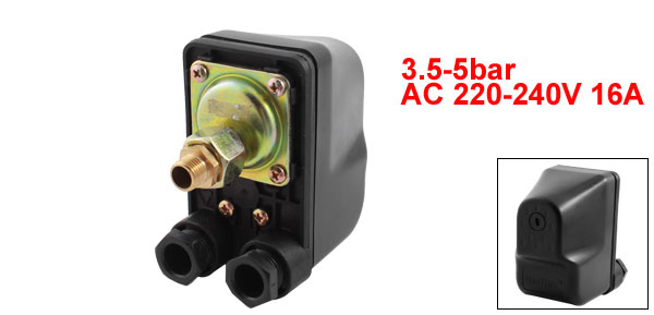Product Name Pressure Switch Type Self Priming Pump Feature Single Port, 3 Poles Rating AC 220-240V 16A Terminal Number 4 Male Thread Diameter 13mm/0.51"(1/4PT) Male Thread Length 7mm/0.28" Pressure Range 3.5-5bar Inlet Hole Dia 14mm/0.55" Body Size 10.7 x 10.3 x 6.1cm/ 4" x 4" x 2.4" (L*W*T) Main Color Gray, Gold Tone Material Plastic, Metal Weight 427g Package Content 1 x Pressure Switch - Reviews