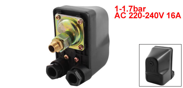 Product Name Pressure Switch Type Self Priming Pump Feature Single Port, Single Pole Rating AC 220-240V 16A Terminal Number 4 Male Thread Diameter 13mm/0.51"(1/4PT) Male Thread Length 7mm/0.28" Pressure Range 1-1.7bar Inlet Hole Dia 14mm/0.55" Body Size 10.7 x 10.3 x 6.1cm/ 4" x 4" x 2.4" (L*W*T) Main Color Gray, Gold Tone Material Plastic, Metal Weight 410g Package Content 1 x Pressure Switch - Reviews