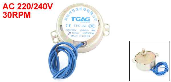 Product Name Synchronous Motor Mode TYD-50 Rated Voltage AC 220/240V Speed 30RPM Power 4W Frequency 50/60Hz Shaft Rotation CCW/CW Mounting Screw Hole Diameter 4.5mm/0.2" Shaft Size 7 x 15mm/ 0.3" x 0.6"(D*L) Body Size 49 x 21mm/1.9" x 0.8" (D*H) Cable Length 45cm/18" Main Color Bronze Tone,Blue Material Metal Net Weight 80g Package 1 x Synchronous Motor - Reviews