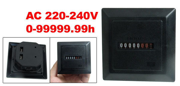 Product Name Hour Meter Model HM-1 Input Power AC 220-240V, 50HZ Digits 7 Range 0-99999.99h Size 7.1 x 7.1 x 3.5cm/ 2.8" x 2.8" x 1.4"(L*W*T) Material Plastic, Electric Components Color Black Net Weight 52g Package Content 1 x Hour Meter - Reviews