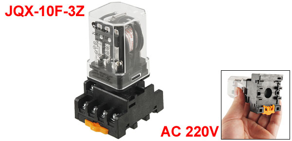 Product Name Power Relay w Socket Model No. JQX-10F-3Z Coil Voltage AC 220 Contact Capacity AC 220V 10A/ DC 24V 10A Type 3PDT Number of Pins 11 Overall Size (Approx.) 51 x 43 x 81mm/ 2" x 1.7" x 3.3" (L*W*H) Shell Material Plastic Main Color Black, Clear Weight 115g Package Content 1 x Power Relay w Socket - Reviews