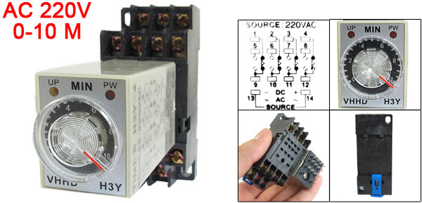 DetailsAC 220V 0-10 Minute 10m Timer Power On Delay Time Relay 14 Pin H3Y-4 + Socket  Product Name Time Relay + Socket Type H3Y-4 Contact Type 4PDT Source AC 220V Contact 5A 250VAC Resistive Load Time Range 0-10 Minutes Number of Terminals 14 Mount Rail Type 35mm DIN Rail Fixing Mount Hole Size 6 x 4mm/ 2.4" x 0.15"(L*W) Fixing Mount Center Hole Distance 59 x 22mm/ 2.3" x 0.9"(L*W) Total Size (Approx.) 68 x 29 x 88mm/ 2.7" x 1.1" x 3.5"(L*W*H) Color Black, Gray Net Weight 83g Package Content 1 x Time Relay 1 x Socket