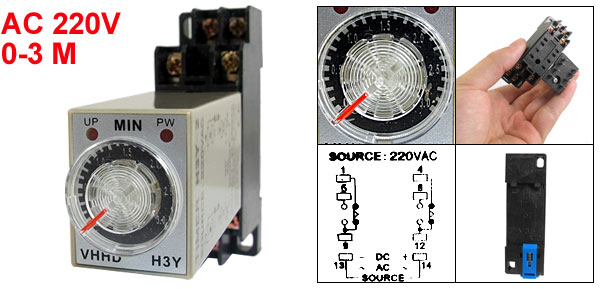 Product Name Time Relay + Socket Type H3Y-2 Contact Type DPDT Source AC 220V Contact 5A 250VAC Resistive Load Time Range 0-3 Minutes Number of Terminals 8 Mount Rail Type 35mm DIN Rail Fixing Mount Hole Size 6 x 4mm/ 2.4" x 0.15"(L*W) Fixing Mount Center Hole Distance 57 x 15mm/2.2" x 0.6"(L*W) Total Size (Approx.) 68 x 22 x 88mm/ 2.7" x 0.9" x 3.5"(L*W*H) Color Black, Gray Net Weight 67g Package Content 1 x Time Relay