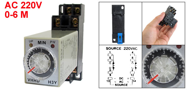DetailsAC 220V 0-6 Minute 6m Timer Power On Delay Time Relay 8 Pin H3Y-2 w Socket  Product Name Time Relay + Socket Type H3Y-2 Contact Type DPDT Source AC 220V Contact 5A 250VAC Resistive Load Time Range 0-6 Minutes Number of Terminals 8 Mount Rail Type 35mm DIN Rail Fixing Mount Hole Size 6 x 4mm/ 2.4" x 0.15"(L*W) Fixing Mount Center Hole Distance 57 x 15mm/2.2" x 0.6"(L*W) Total Size (Approx.) 68 x 22 x 88mm/ 2.7" x 0.9" x 3.5"(L*W*H) Color Black, Gray Net Weight 66g Package Content 1 x Time Relay 1 x Socket