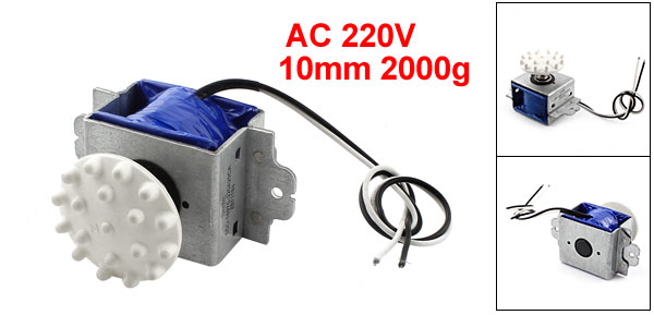 DetailsAC 220V 10mm 2000g Spring Loaded Open Coil Form Push Pull Solenoid Electromagnet  Product Name AC Solenoid Electromagnet Coil Voltage AC 220V Action Form Push Pull Type Rated Stroke & Force 10mm, 2000g Connection Rate 10% Body Size 57 x 48 x 41mm / 2.2" x 1.9" x 1.6" (L*W*H) Total Size 92 x 52 x 70.5mm/3.6" x 2" x 2.8" (L*W*H) Cable Length 33cm / 13" Plunger Dia. 16mm / 0.63" Mounting Hole Dia 4.5mm/0.18 Mounting Hole Distance 85mm/33"(Center to Center) Material Metal, Electronic Parts Net Weight 527g Package Content 1 x AC Solenoid Electromagnet