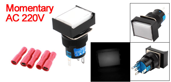 AC 220V 16mm Panel SPDT Momentary Rectangle Pushbutton Switch w Crimp Connectors