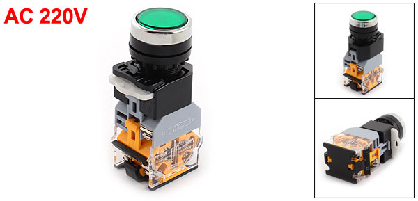 AC 220V 1NO 1NC DPST Flat Momentary Push Button Switch w Green LED Light