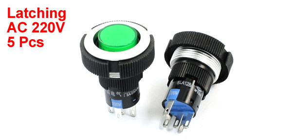 Product Name Push Button Switch Action Type Latching Ith 5A Push Button Rating AC 220V 250V Lamp Voltage AC 220V Lamp Color Green Contact Type SPDT( 1 NO 1 NC) Pin Number 5 Thread Dia 22mm/0.87" Each Size 29 x 33mm/ 1.2" x 1.3" (D*L) Button Dia 15mm/0.6" External Material Plastic External Color Black, Green Net Weight 61g Package Content 5Pcs x Push Button Switch