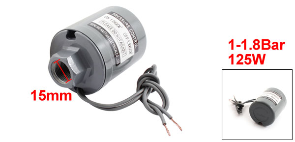 OFF:1.8Kgf/cm²Pressure Range 1-1.8kgf/cm²/1-1.8Bar Actact Type SPST Female Thread Type 15mm/0.6"(3/8PT) Working Voltage AC 220V-240V 16A 125W Wire Length 27.5cm/10.8" Size 75 x 50mm/3" x 2" (L*Max D) Material Plastic, Stainless Steel Color Gray Weight 171g Package Content 1 x Pressure Switch