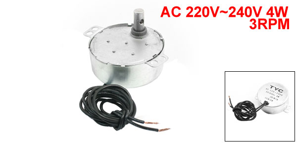 Product Name Synchronous Motor Rating AC 220V~240V 4W 50/60Hz Speed 3RPM Type CCW/CW Cable Length 48cm/18.9" Connector Hole Dia 3mm/0.12" Mounting Screw Hole Diameter 4.5mm/0.18" Shaft Size 7 x 15mm/ 0.28" x 0.6"(D*L) Body Size 49 x 20mm/ 2" x 0.8" (D*T) Main Color Silver Tone Material Metal Net Weight 88g Package 1 x Synchronous Motor - Reviews