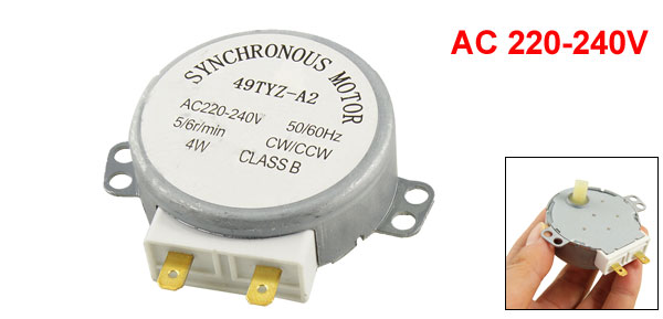 Product Name Synchronous Motor Model 49TYZ-A2 Direction CW/CCW Voltage AC 220V-240V Frequency 50/60Hz Power 4W Speed 5/6RPM Overall Size 65 x 60 x 27mm/ 2.6" x 2.4" x 1" (L*W*T) Shaft Size 7 x 11mm/ 0.27" x 0.43" (D*L) Mount Hole Dia. 4mm/ 0.16" Main Material Metal Color As Picture shown Net Weight 73g Package Content 1 x Synchronous Motor - Reviews