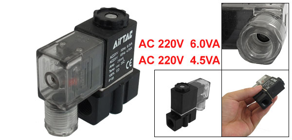 DetailsAC 220V 29mA 2 Position 2 Way Pneumatic Solenoid Valve 1/4"PT  Product Name Solenoid Valve Fluid 40 Micron Filtered Air Operation Type Direct Action Type 2 Position 2 Way Power Consumption AC 220V 50Hz 6.0VA AC 220V 60Hz 4.5VA Current 29mA Temperature Rise 35C Fix Hole Diameter 3.5mm/ 9/64" Port Size(Approx) 1/4"PT Hex Connector Inner Dia(Approx) 10mm / 2/5" Total Size (Approx) 7 x 6 x 2.2cm/ 2.8" x 2.4" x 0.87"(L*W*T) Color Gray, Black Net Weight 117g Package Content 1 x Solenoid Valve