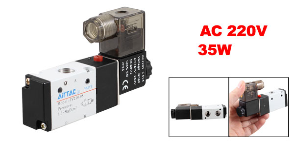 DetailsAC 220V 35W 3V210-08 2 Position 3 Way Pneumatic Solenoid Valve  Product Name Pneumatic Solenoid Valve Model 3V210-08 Type 2 Position 3 Way Material Metal, Plastic Working Voltage AC 220V Power 35W Operating Pressure 1.5~ 8kgf/cm2 Voltage Range AC187V-253V Inlet/ Outlet Port Diameter 11.5mm / 0.45" Total Size (Approx.) 11.2 x 6.5 x 2.1cm / 4.4" x 2.56" x 0.83" (L * W * T) Color Siver Tone, Black Weight 189g Package Content 1 x Pneumatic Solenoid Valve