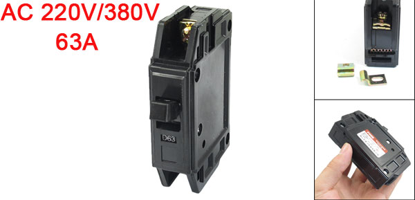 DetailsAC 220V/380V 63A 1 Poles 1P Moulded Case Circuit Breaker Black DZ12-63  Product Name Moulded Case Circuit Breaker Model No. DZ12-63 Poles 1 Pole Rated Voltage AC 220V/380V, 50Hz Rated Current 63A Breaking Capacity 3000A Total Size(Approx) 95 x 25 x 75mm/ 3.7" x 1" x 0.9"(L*W*H) External Material Plastic Color Black Net Weight 117g Package Content 1 x Moulded Case Circuit Breaker