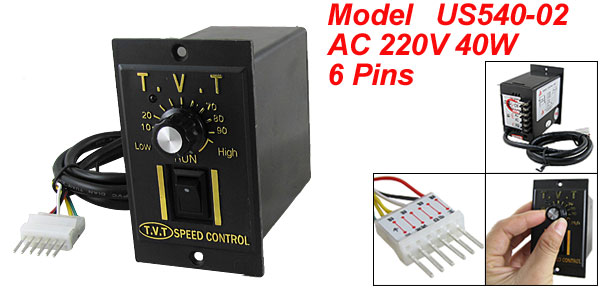 Product Name Motor Speed Controller Model US540-02 Material Plastic, Electronic Part Connector 6 Pins Rated Value AC 220V, 50HZ Power 40W Size 110 x 59 x 98mm/ 4.3" x 2.3" x .9" (L*W*H) Cable Length 60cm/ 23.6'' Color Black Weight 212g Package Content 1 x Motor Speed Controller - Reviews