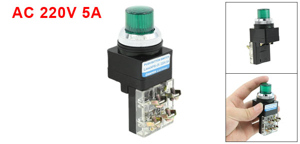 Product Name Push Button Switch Type NPB-25 Working Voltage & Electricity AC 220V, 5A Max Voltage 600V Terminal Quantity 6 Panel Cutout Diameter 25mm / 1" Fit Panel Max. Thickness 3mm / 0.12" Total Size(Approx) 8.5 x 4.5 x 3.3cm / 3.3" x 1.8" x 1.3" (L*W*H) External Material Plastic, Electric Parts Color Black, Green Net Weight 61g Package Content 1 x Push Button Switch - Reviews