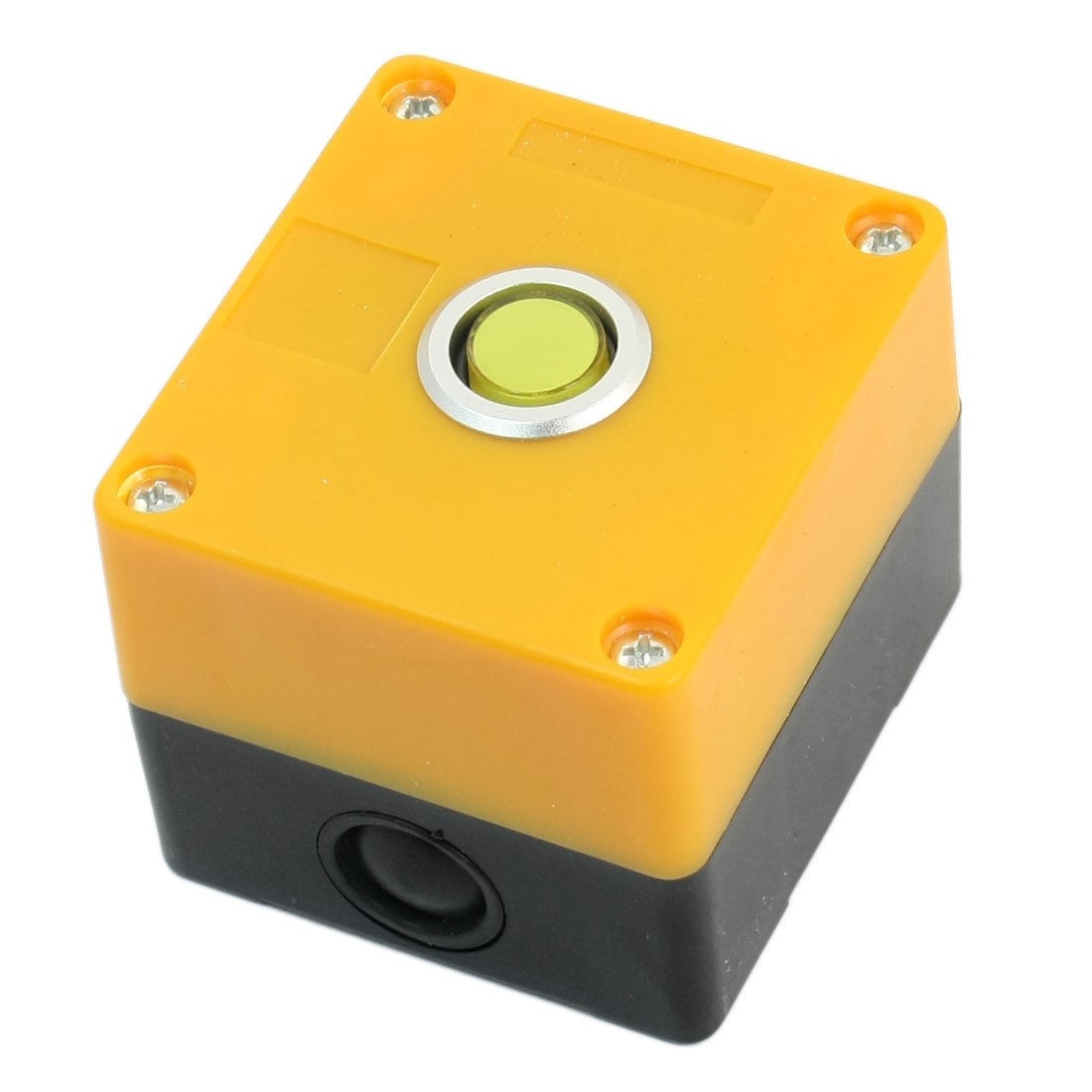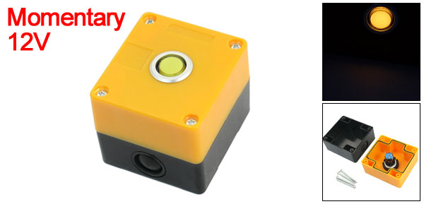 Product Name Push Button Station Action Type Momentary Hole Diameter 22mm/ 0.87" Ith 5A Rating AC 220V 5A Lamp Voltage 12V Lamp Color Yellow Contact Type SPDT( 1 NO 1 NC) Box Size 78 x 71 x 65mm/3" x 2.8" x 2.5" (L*W*H) Button Dia 15mm/0.6" Mounting Hole Diameter 5mm/ 0.2" Mounting Hole Center Distance 64 x 58mm/2.5" x 1.5"(L*W) External Material Plastic External Color Black, Yellow Net Weight 113g Total Weight 100g Package Content 1 x Push Button Station