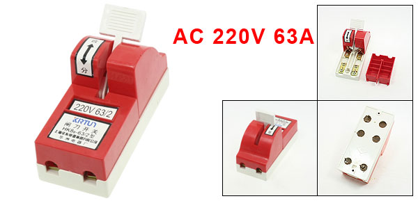 Product Name Disconnect Switch Model No. HK8B-63/2 Phase 2 Throw 1 Pole 1 Rated Voltage AC 220V Rated Current 63A Mounting Hole Diameter 5mm/ 0.2" Mounting Hole Center Distance 142mm/5.6" Overall Size(Approx) 162 x 70 x 100mm/ 6.4" x 2.8" x 3.9" (L*W*H) External Material Plastic, Ceramic Color Red, White Net Weight 476g Package Content 1 x Disconnect Switch - Reviews