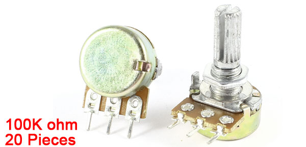 Product Name Potentiometer Resistance Value 100K ohm Power AC 220V 6A Adjustment Type Top Adjustment Type Single Linear(Type B) Features Knurled Shaft Shaft Diameter 6mm / 0.2" Shaft Length 13mm / 0.55" Mounting Thread Diameter 6.6mm / 0.26" Base Size 16 x 8.5mm / 0.63" x 0.33"(D*H) Total Height 29mm/1.1" Material Metal, Electronic Parts,Carbon Film Net Weight 142g Package 20 x Potentiometer - Reviews