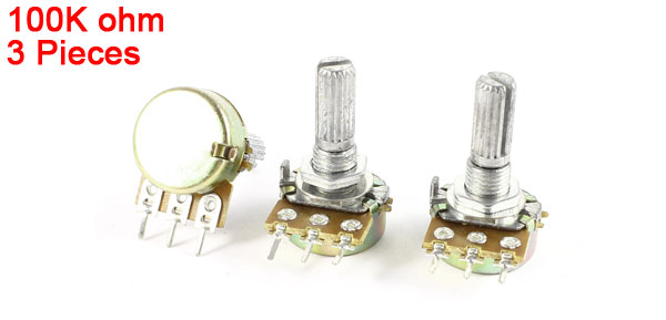 DetailsAC 220V 6A 100K Ohm Top Adjustment Single Turn Rotary Taper Potentiometer 3 Pcs  Product Name Potentiometer Resistance Value 100K ohm Power AC 220V 6A Adjustment Type Top Adjustment Type Single Linear(Type B) Features Knurled Shaft Shaft Diameter 6mm / 0.2" Shaft Length 13mm / 0.55" Mounting Thread Diameter 6.6mm / 0.26" Base Size 16 x 8.5mm / 0.63" x 0.33"(D*H) Total Height 29mm/1.1" Material Metal, Electronic Parts,Carbon Film Net Weight 22g Package 3 x Potentiometer