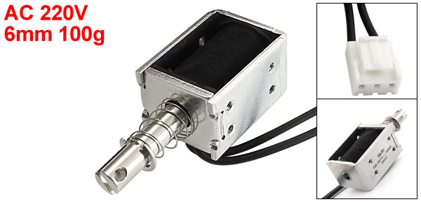 Product Name AC Solenoid Electromagnet Coil Voltage AC 220V Action Form Pull Type Rated Stroke & Force 6mm, 100g Connection Rate 100% Body Size 37 x 26 x 20mm / 1.5" x 1" x 0.8"(L*W*H) Connector Type JST Plug(13.5x12mm) Cable Length 86cm / 2.8Ft Plunger Dia. 8mm / 0.31" Plunger Connect Hole Dia. 3mm/0.12" Mounting Hole Dia. 3mm/0.12" Material Metal, Electronic Parts Net Weight 103g Package Content 1 x AC Solenoid Electromagnet - Reviews