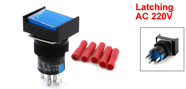 DC 30V 5ALight Voltage AC 220V Thread Dia 16mm/0.63" Total Size(Not Included Pin) 31 x 24 x 17mm /1.2" x 0.9" x 0.67" (L *W *H) Light Color Blue External Color Red, Blue, Black Material Plastic, Metal Net Weight 12g Package Content 1 x Rectangle Head Push Button Switch