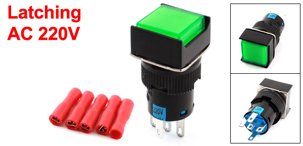 AC 220V Green Lamp 16mm SPDT Locking Push Button Switch + 5pcs Female Terminals