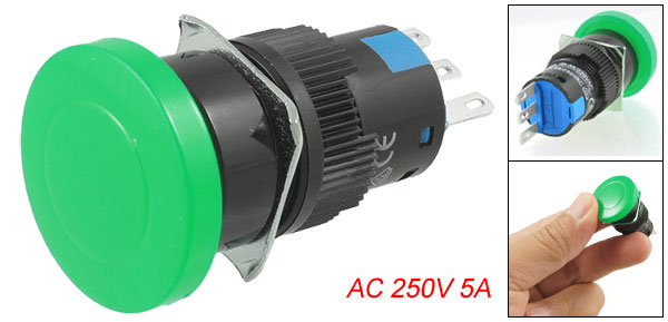 Item Name Push Button Switch Type Mushroom 1NO 1NC Momentary Contact Voltage AC 250V 5A Ith AC 220V 5A Button Color Green Button Diameter 2.3cm/ 0.9" Size 4.5 x 2.3cm / 1.8" x 0.9" (L*D) Material Plastic, Metal Net Weight 7g Package Content 1 x Push Button Switch - Reviews