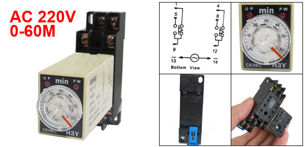 Product Name Time Relay + Socket Type H3Y-2 Contact Type DPDT Source AC 220V Contact 5A 250VAC Resistive Load Time Range 0-60 Minutes Number of Terminals 8 Mount Rail Type 3.5mm DIN Rail Fixing Mount Hole Size 6 x 4mm/ 2.4" x 0.15"(L*W) Fixing Mount Center Hole Distance 57 x 15mm/2.2" x 0.6"(L*W) Total Size (Approx.) 68 x 22 x 88mm/ 2.7" x 0.9" x 3.5"(L*W*H) Color Black, Gray Net Weight 70g Package Content 1 x Time Relay