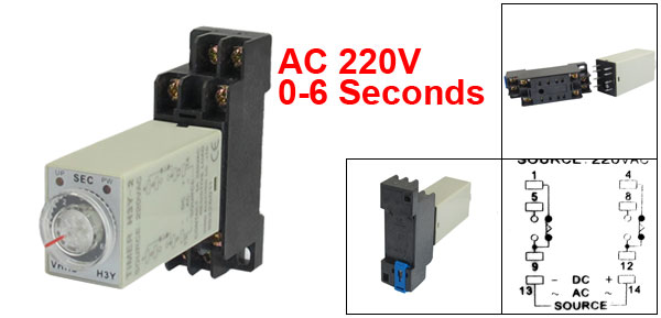 Product Name Time Relay + Socket Type H3Y-2 Contact Type DPDT Source AC 220V Contact 5A 250VAC Resistive Load Time Range 0-6 Seconds Number of Terminals 8 Mount Rail Type 3.5mm DIN Rail Fixing Mount Hole Size 6 x 4mm/ 2.4" x 0.15"(L*W) Fixing Mount Center Hole Distance 57 x 15mm/2.2" x 0.6"(L*W) Total Size (Approx.) 68 x 22 x 88mm/ 2.7" x 0.9" x 3.5"(L*W*H) Color Black, Gray Net Weight 67g Package Content 1 x Time Relay