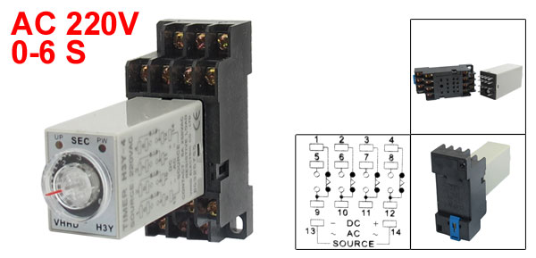 Product Name Time Relay + Socket Type H3Y-4 Contact Type 4PDT Source AC 220V Contact 5A 250VAC Resistive Load Time Range 0-6 Seconds Number of Terminals 14 Mount Rail Type 3.5mm DIN Rail Fixing Mount Hole Size 6 x 4mm/ 2.4" x 0.15"(L*W) Fixing Mount Center Hole Distance 59 x 22mm/2.3" x 0.9"(L*W) Total Size (Approx.) 68 x 29 x 88mm/ 2.7" x 1.1" x 3.5"(L*W*H) Color Black, Gray Net Weight 82g Package Content 1 x Time Relay