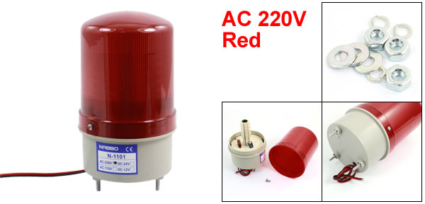 DetailsAC 220V Industrial LED Flash Strobe Light Emergency Warning Lamp Red N-1101  Product Name Industrial Signal Light Model N-1101 Voltage AC 220V Light Color Red Material Plastic, Electronic Parts Size 15.5 x 9cm / 6" x 3.5"(L*D) Mount Screw Dia 4mm/ 0.16" Cable Length 28cm/11" Body Color Red, Beige Net Weight 191g Package Content 1 x Industrial Signal Light