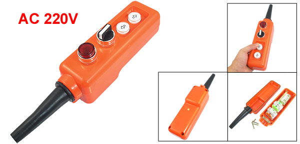 Product Name Hoist Pushbutton Switch Model No. COB COJ2125 Button Latching Red Lamp, 3 Position Rotary Selector Switch, Momentary Up and Down Push Button Selector Handle Mode 3 Position IEC 337 Lamp Voltage AC 220V Ui 660V Ith 10A Main Body Size 20 x 5.8 x 6.5cm / 7.9" x 2.3" x 2.6"(L*W*H) Insulating Tube Length 10.2cm / 4" Fit Cable Diameter 1.1cm / 0.43" External Material Plastic, Rubber Color Orange Red, Black Net Weight 353g Package Content 1 x Hoist Pushbutton Switch - Reviews