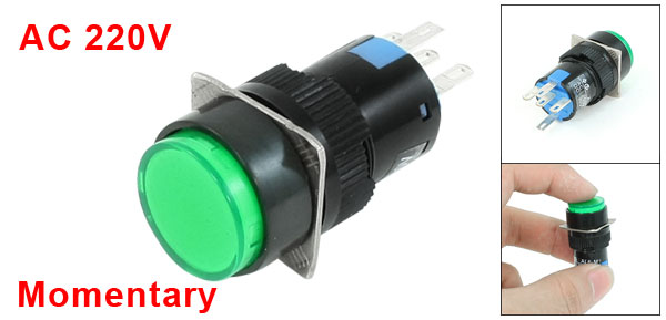 Product Name Push Button Switch Action Type Momentary Contact Type 1NO, 1NC, SPDT Light Voltage AC 220V Rating Voltage AC 250V 3A DC 30V 5A Light Color Green Shell Color Black, Green Terminals Quantity 5 Pins Mounting Hole Diameter 16mm / 0.63" Overall Size (Approx) 17 x 17 x 40mm / 0.67" x 0.67" x 1.57" (L*W*T) Weight 8g Package Content 1 x Push Button Switch - Reviews