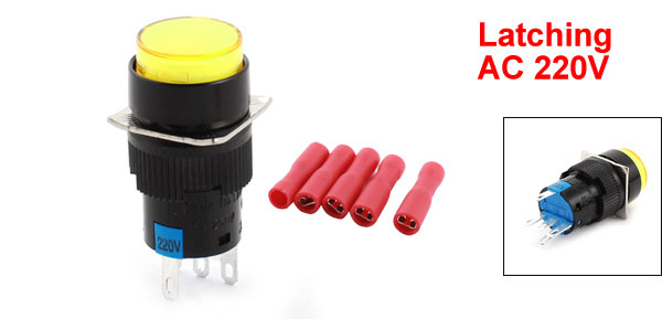 Item Name Push Button Switch w Crimp Connector Contact Type SPDT(1NO 1NC) Action Type Latching Pin Number 5 Voltage, Current AC 250V 5A Light Voltage AC 220V Thread Dia 16mm/0.63" Total Size(Not Included Pin) 30 x 15mm /1.2" x 0.6" (L*D) Light Color Yellow Material Plastic, Metal Net Weight 10g Package Content 1 x Round Push Button Switch