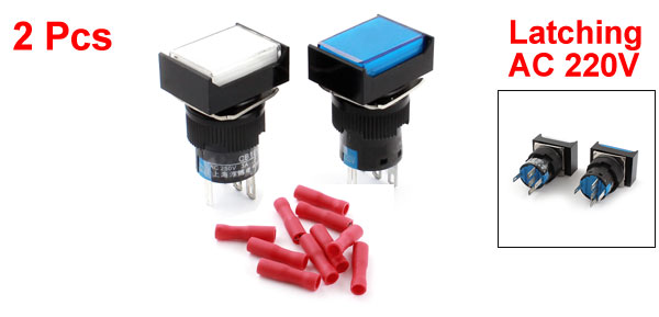 DC 30V 5ALight Voltage AC 220V Thread Dia 16mm/0.63" Total Size(Not Included Pin) 31 x 24 x 17mm /1.2" x 0.9" x 0.67" (L *W *H) Light Color White, Blue External Color Red, White, Blue, Black Material Plastic, Metal Net Weight 23g Package Content 2 x Rectangle Head Push Button Switch